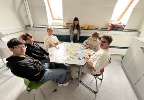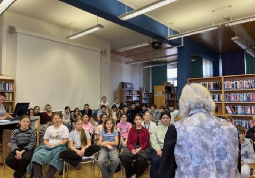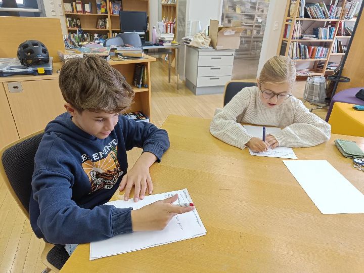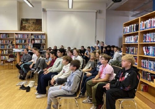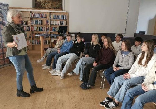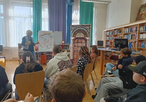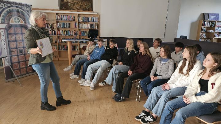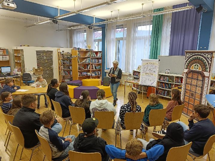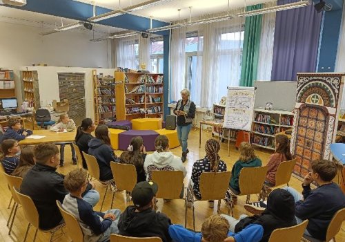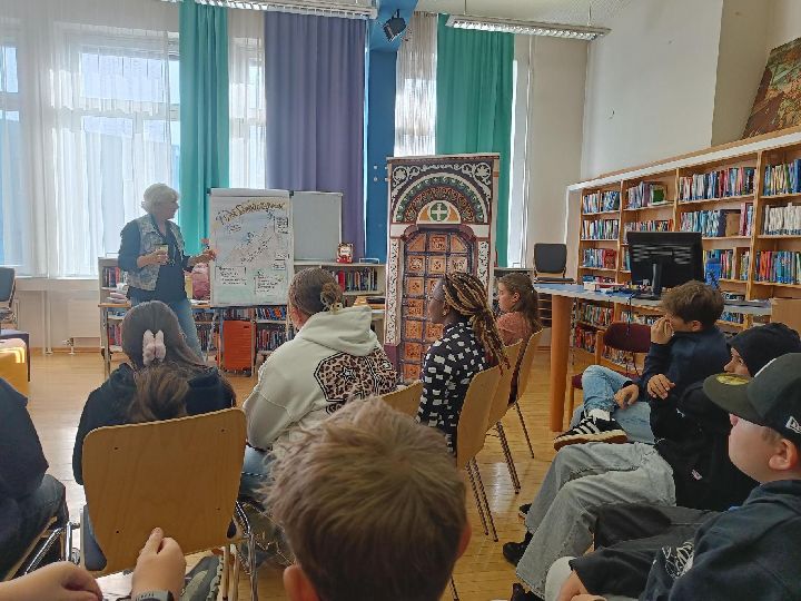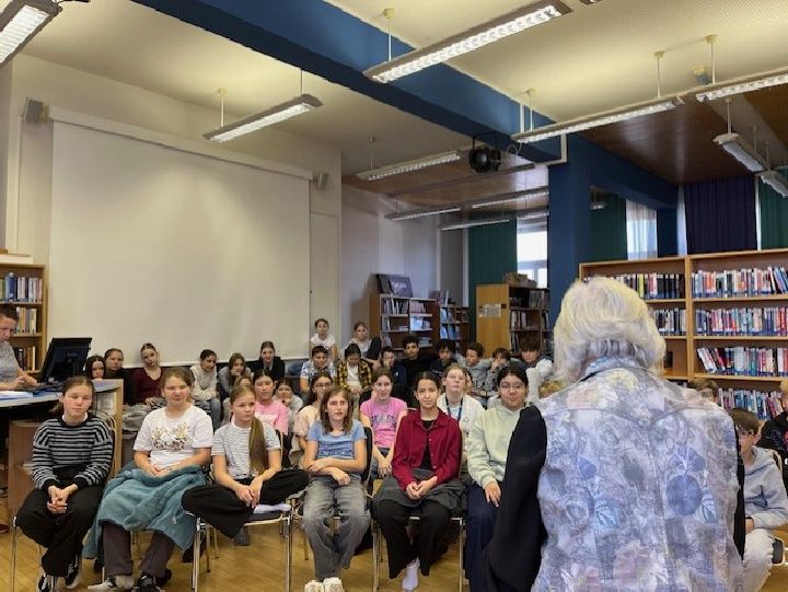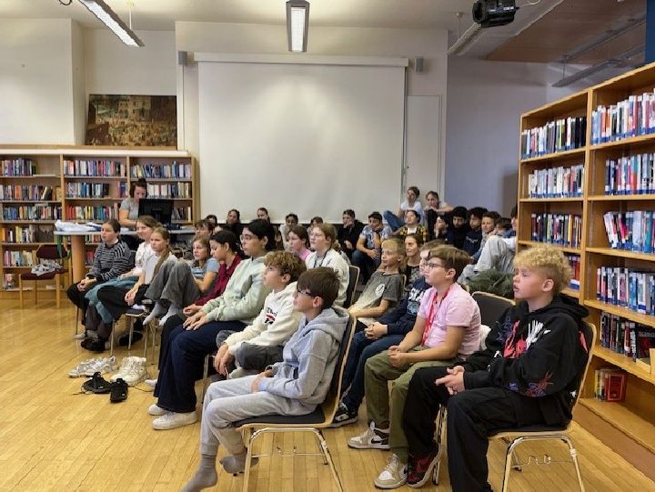Mit großer Begeisterung erzählte sie, wie die Idee zu ihrem Werk entstanden ist, und zeigte Fotos der Schule in Bernbach, die sie zur Gestaltung der fiktiven Schule im Roman inspiriert hat. Anschließend nahm sie die Schülerinnen und Schüler mit auf eine spannende Reise nach Temporibus. Dort durfte das junge Publikum selbst entscheiden, welcher Figur es folgen wollte – Elli oder ihrem Bruder Albert.