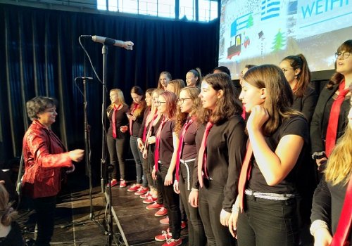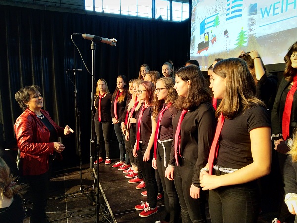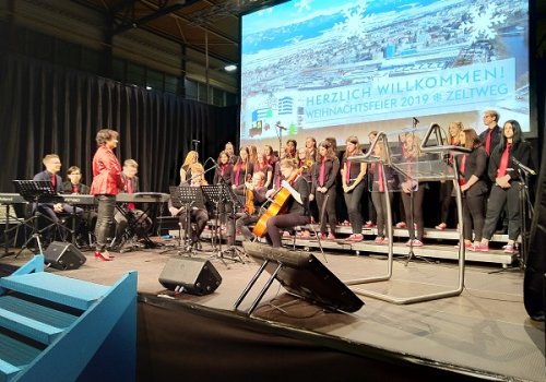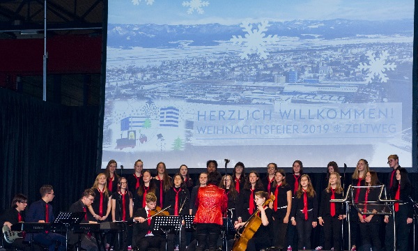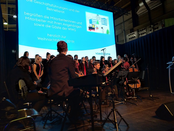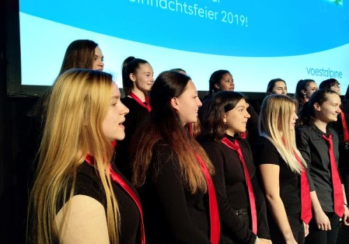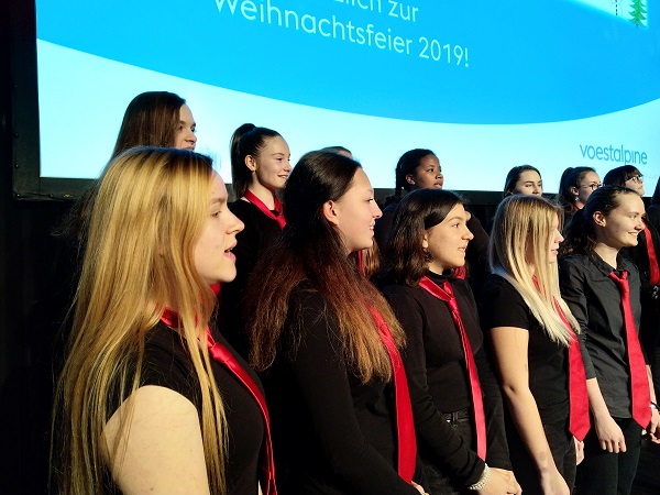 Und nicht nur die Geschäftsführer, sondern ebenso viele Mitarbeiterinnen und Mitarbeiter der Firma VOEST, die sich zur Weihnachtsfeier in der festlich geschmückten und beleuchteten Werkshalle am Standort Zeltweg versammelt hatten, waren von den feierlichen und stimmungsvollen Darbietungen unserer Schülerinnen und Schüler unter der Leitung von Prof.in Mag.a Ingrid ADAM-Kaltenegger begeistert.
