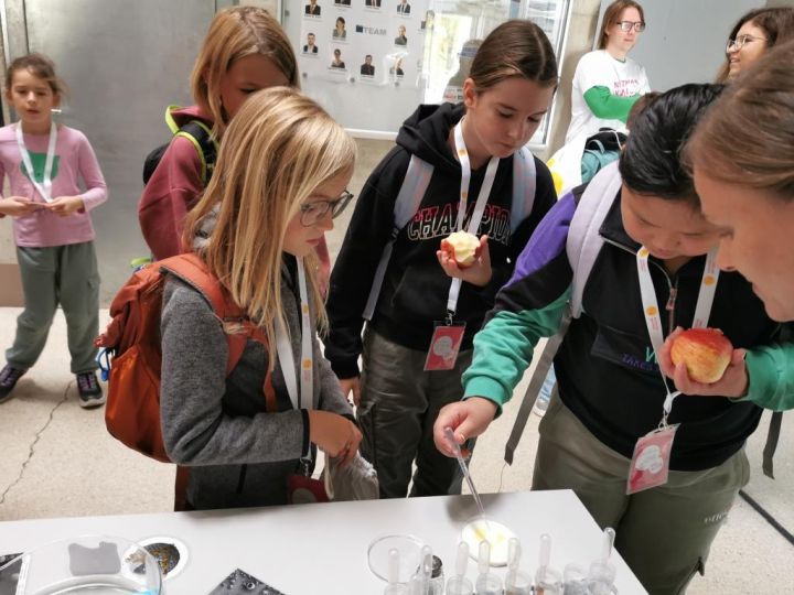 Selbst konnten die SchülerInnen in einem Fahrzeug sitzend auch am Bildschirm-Rennsimulator über eine Rennstrecke „brausen“. Wollten sie den Nachthimmel erklärt bekommen, begaben sie sich durch den Spalt eines riesengroßen aufblasbaren Würfels unter den Sternenhimmel. Vom Makrokosmos ging es in die Welt des winzig Kleinen. Wie sieht die Brownsche Molekularbewegung aus? Wie docken eingenommene Medikamente an das Organ an, wo sie wirken sollen? All diese Fragen und sehr viele mehr wurden anhand von Versuchen beantwortet, wobei man sich mitunter Modelle zur Veranschaulichung bedienen musste. So geschehen bei der Nanophysik.